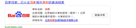 觸發(fā)機(jī)制:無論搜索任何關(guān)鍵詞,只要通過商標(biāo)認(rèn)證的網(wǎng)址,被檢索出現(xiàn)在百度搜索結(jié)果中,都會(huì)展現(xiàn)藍(lán)色?標(biāo)。