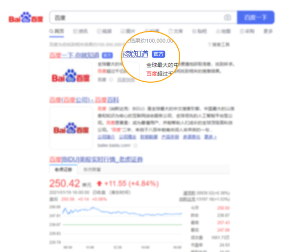 高級(jí)版觸發(fā)詞審核通過并生效后,當(dāng)網(wǎng)民精確搜索該觸發(fā)詞時(shí),若認(rèn)證通過的精確網(wǎng)址出現(xiàn)在搜索結(jié)果中,將為其展現(xiàn)藍(lán)色“官方”標(biāo)識(shí)。